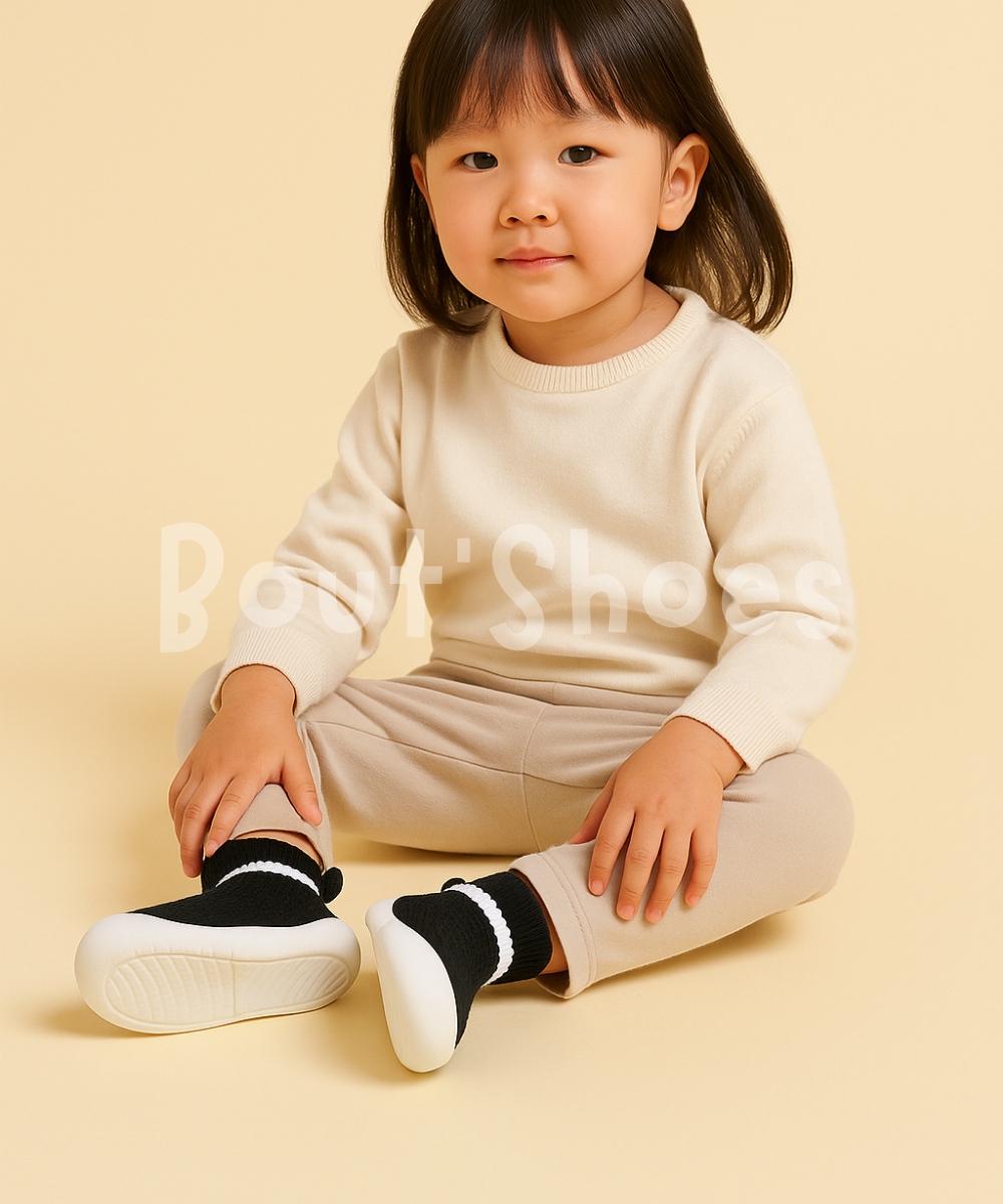 Les Bout’Shoes sont souvent approuvées par les crèches : elles sont faciles à enfiler, antidérapantes, et restent bien aux pieds.